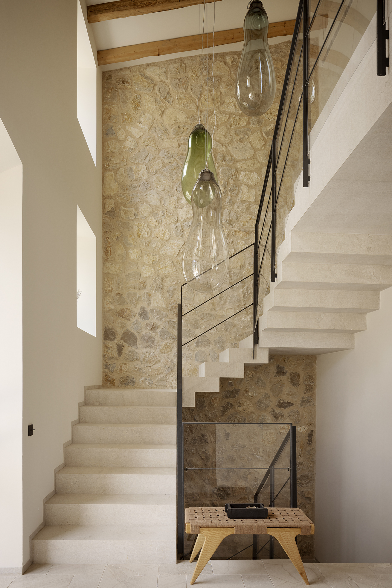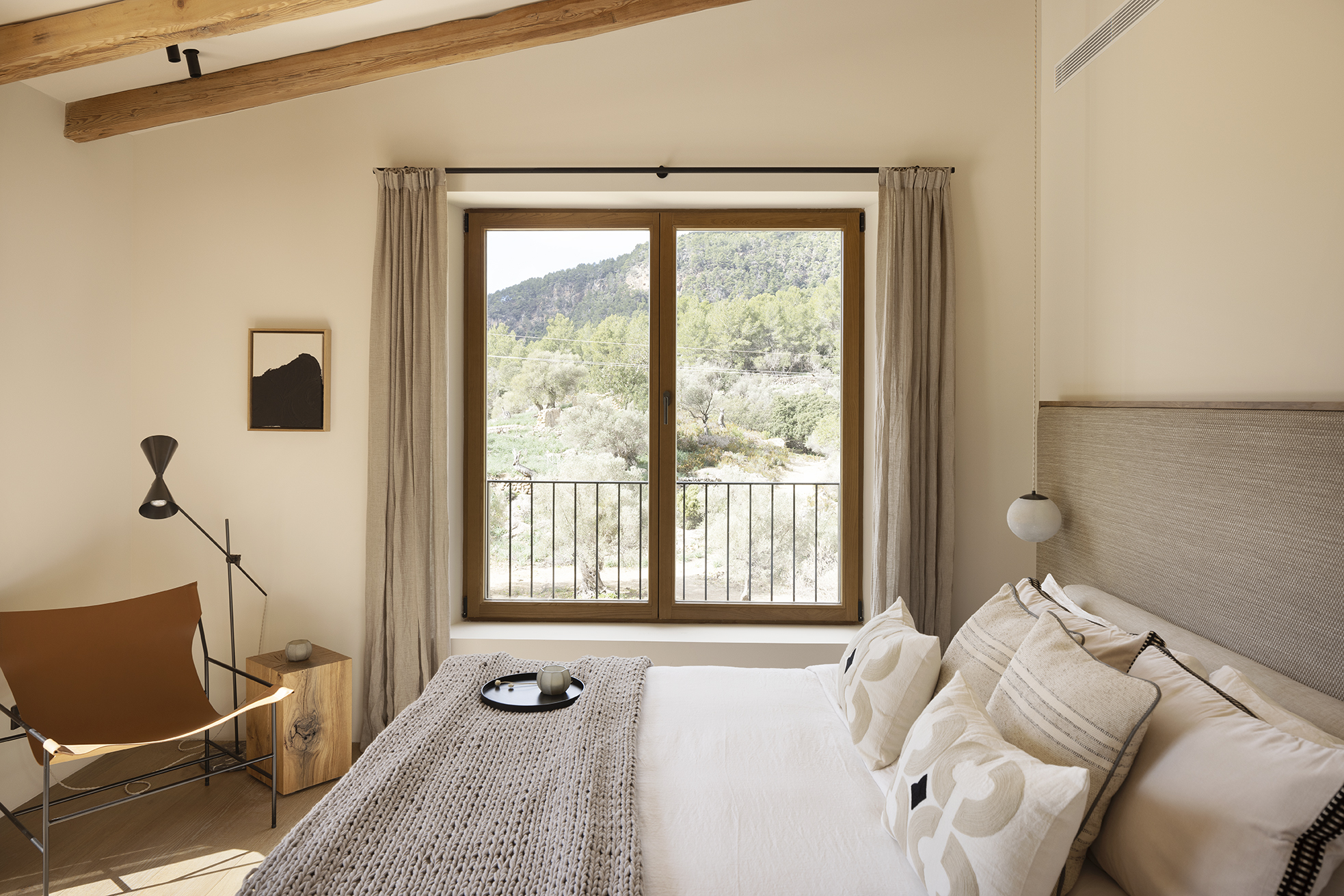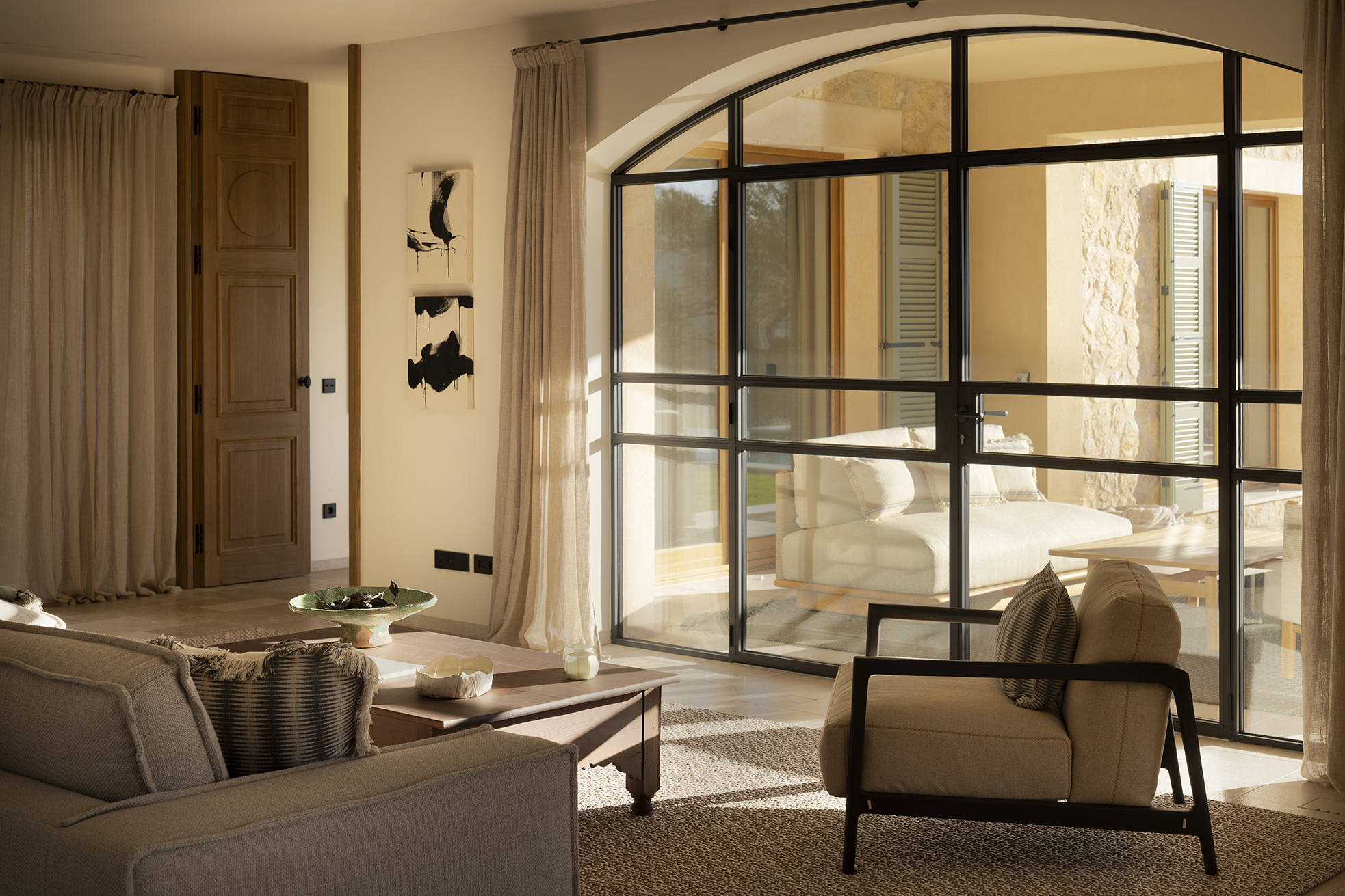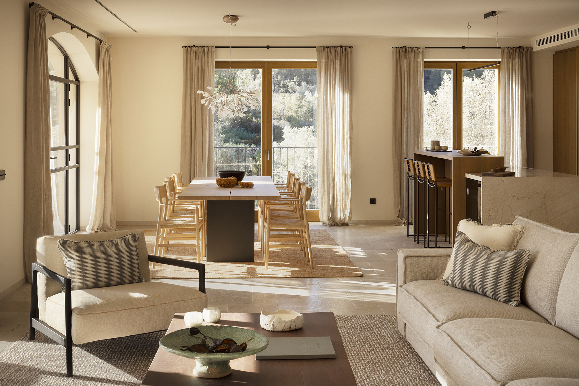 Edle Hölzer verleihen dem Interieur eine warme Eleganz, handwerklich bearbeiteter Naturstein und handgefertigte Schmiedearbeiten einen rustikalen Charme. Hochwertige Naturtextilien wie Leinen und moderne Interpretationen mallorquinischer Textilkunst prägen die Einrichtung. Moderne Küchentechnik und Hightech-Elemente sorgen für zeitgemäßen Komfort. Nachhaltige Materialien, darunter fair produzierte Teppiche, setzen auf verantwortungsvollen Genuss. Die Finca ist nicht nur ein Rückzugsort, sondern ein harmonisches Zusammenspiel von Luxus, traditionellem Charme und moderner Nachhaltigkeit auf der bezaubernden Insel Mallorca.