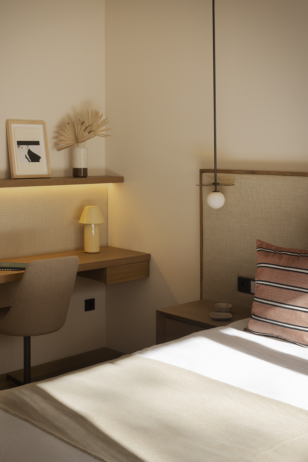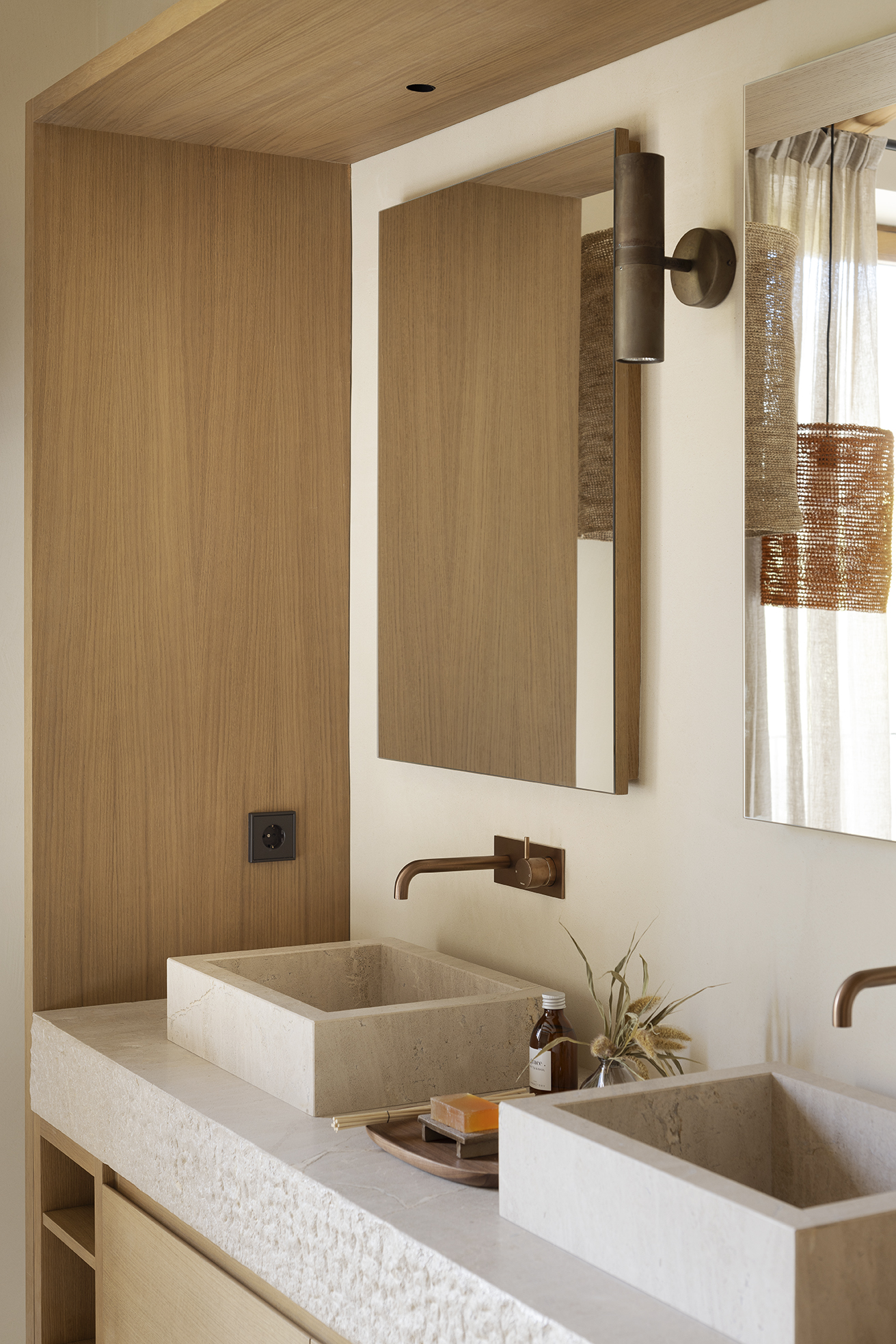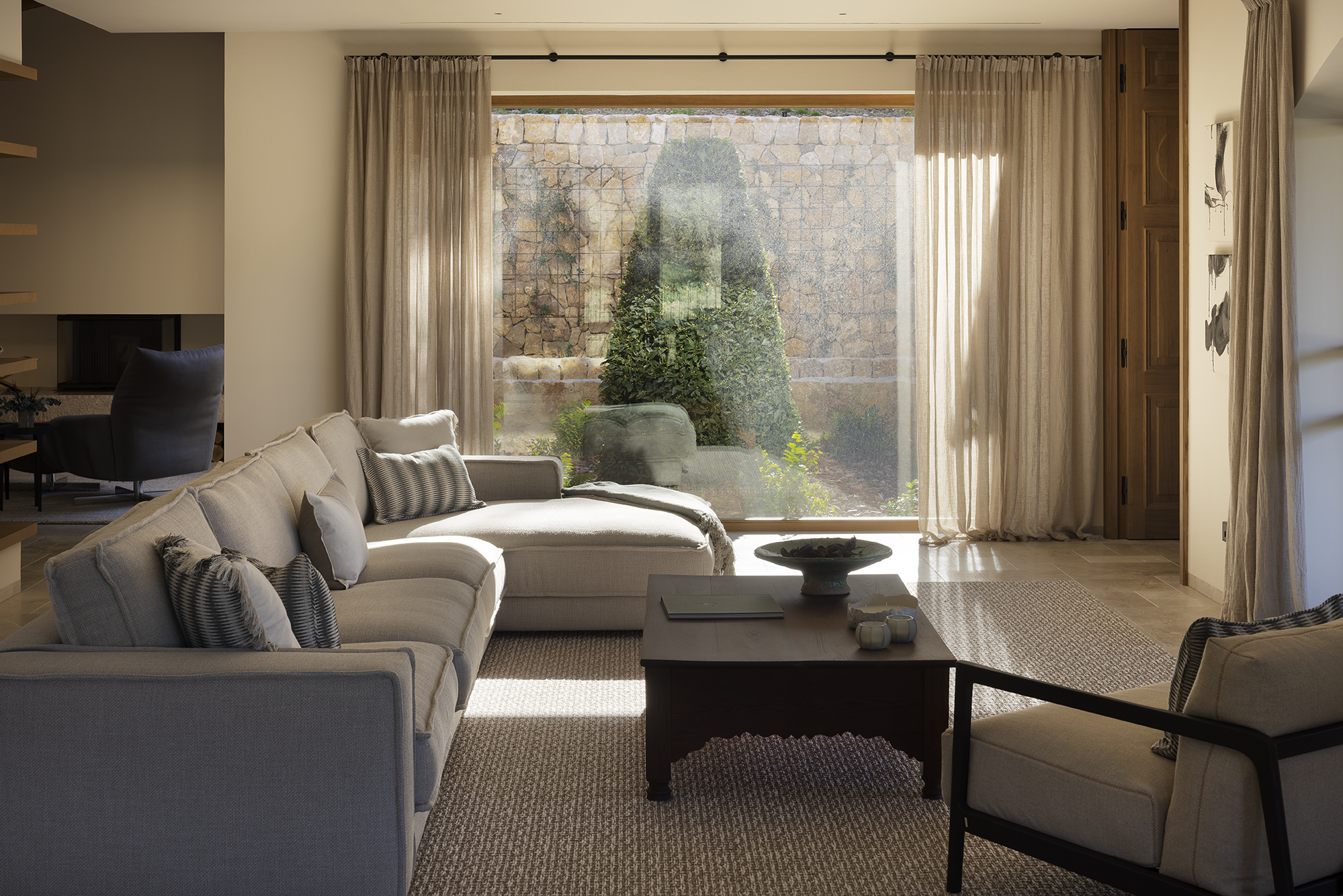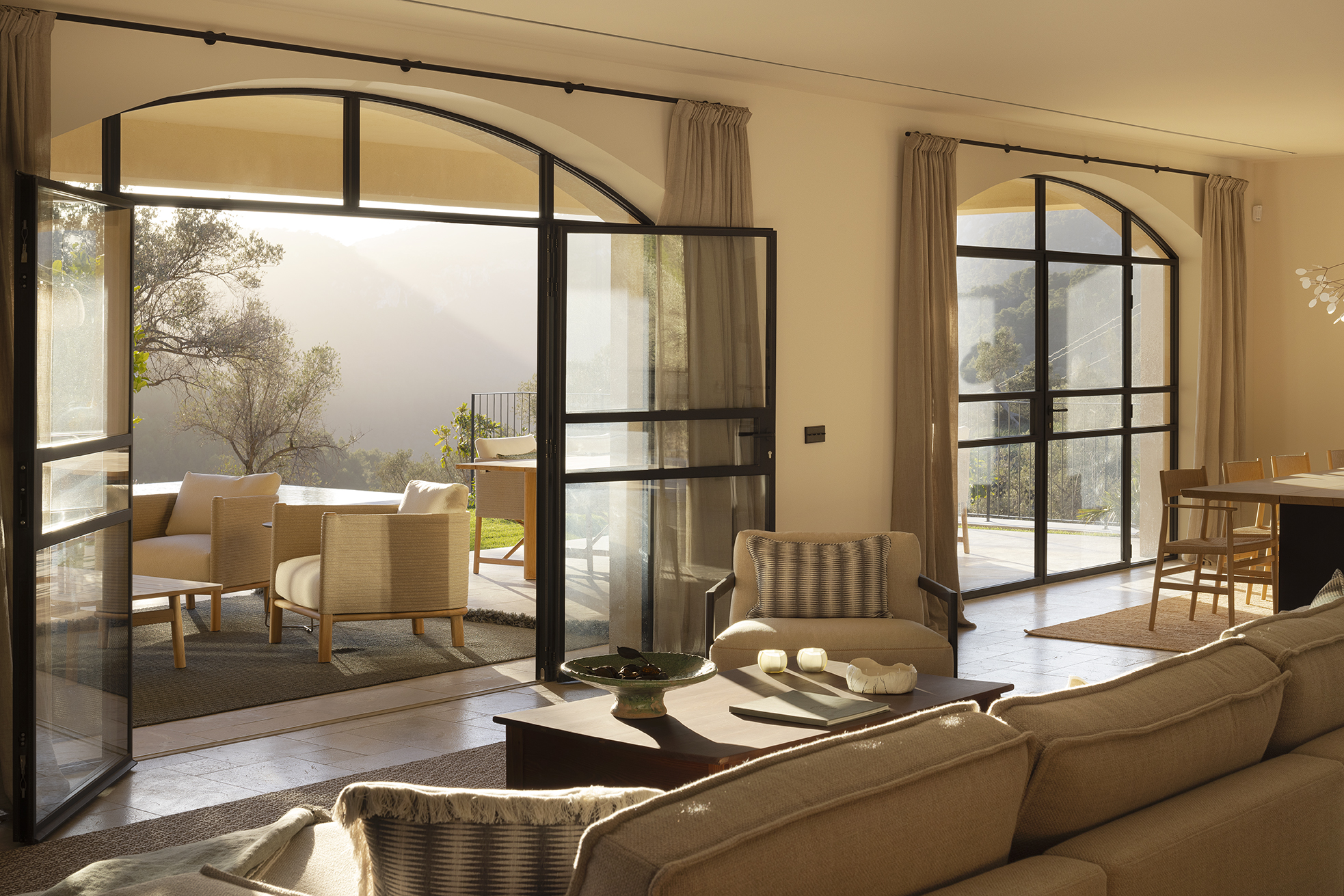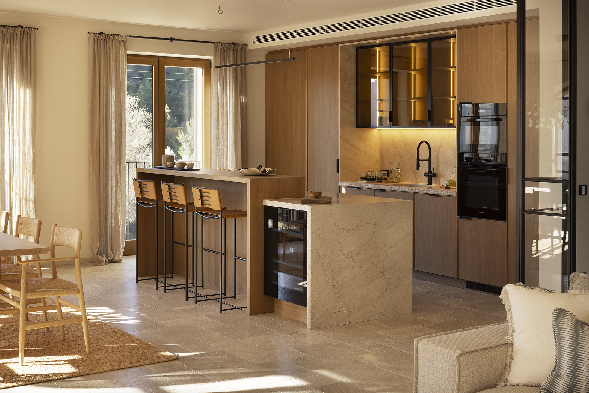 Edle Hölzer verleihen dem Interieur eine warme Eleganz, handwerklich bearbeiteter Naturstein und handgefertigte Schmiedearbeiten einen rustikalen Charme. Hochwertige Naturtextilien wie Leinen und moderne Interpretationen mallorquinischer Textilkunst prägen die Einrichtung. Moderne Küchentechnik und Hightech-Elemente sorgen für zeitgemäßen Komfort. Nachhaltige Materialien, darunter fair produzierte Teppiche, setzen auf verantwortungsvollen Genuss. Die Finca ist nicht nur ein Rückzugsort, sondern ein harmonisches Zusammenspiel von Luxus, traditionellem Charme und moderner Nachhaltigkeit auf der bezaubernden Insel Mallorca.