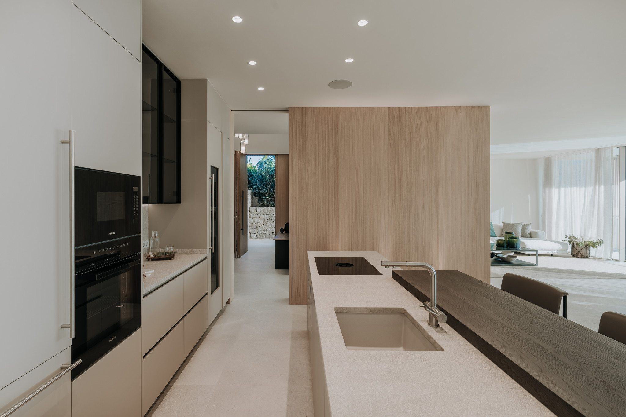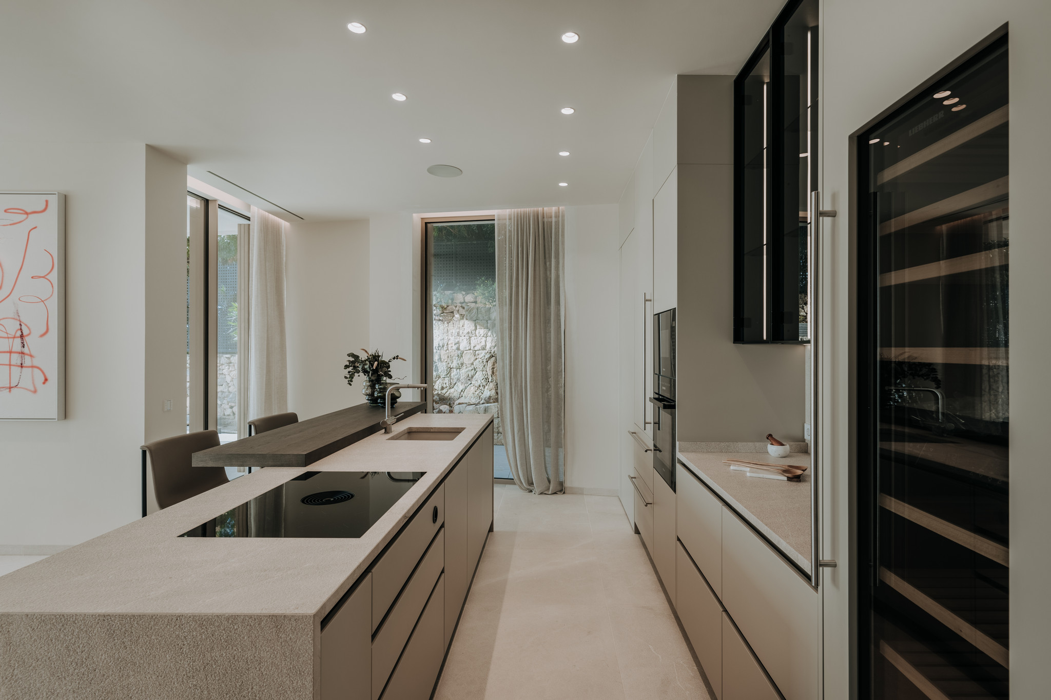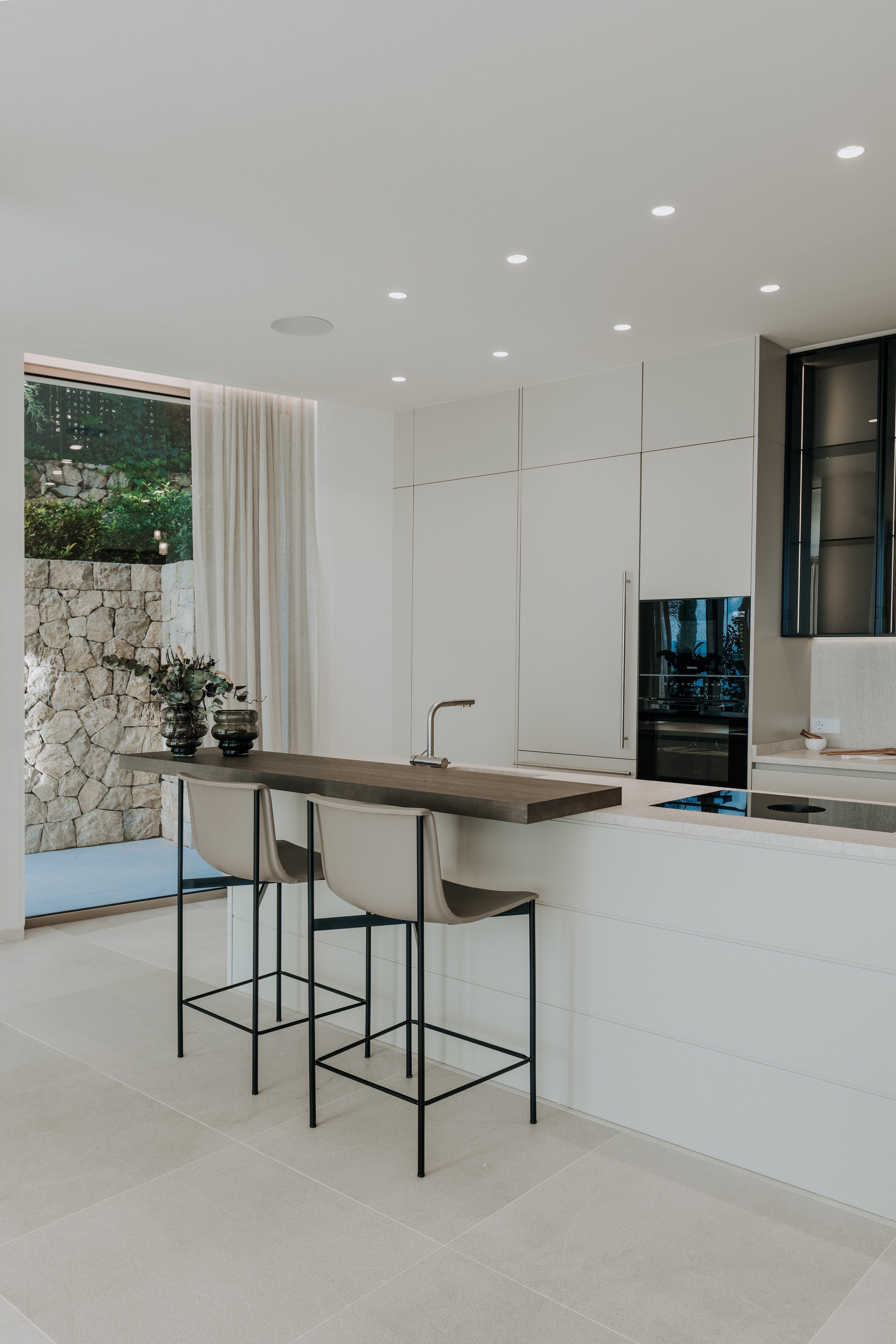 Zeitlose Ästhetik und authentische Natürlichkeit kennzeichnen auch den Materialmix der Villa. Ob handwerklich bearbeiteter Naturstein für die Böden und Wände, hochwertige spanische Eiche für Verkleidungen, Elemente aus Leinen oder Geländer aus Glas, die das offene Raumgefühl unterstreichen – jedes Material trägt auf seine Weise zu einem exklusiven Raumgefühl bei. Dabei wird leidenschaftlich Wert auf kleinste Details gelegt. So werden Wandsteine beispielsweise anhand ihrer Aderung ausgewählt und entsprechend angeordnet. Die anspruchsvollen Möbel werden ausschließlich von ausgewählten Qualitätstischlern gefertigt. Und auch Armaturen sowie Küchentechnik kommen ausnahmslos von renommierten Herstellern. Für ein luxuriöses Gesamtkunstwerk, das bis ins letzte Detail höchsten Ansprüchen gerecht wird.