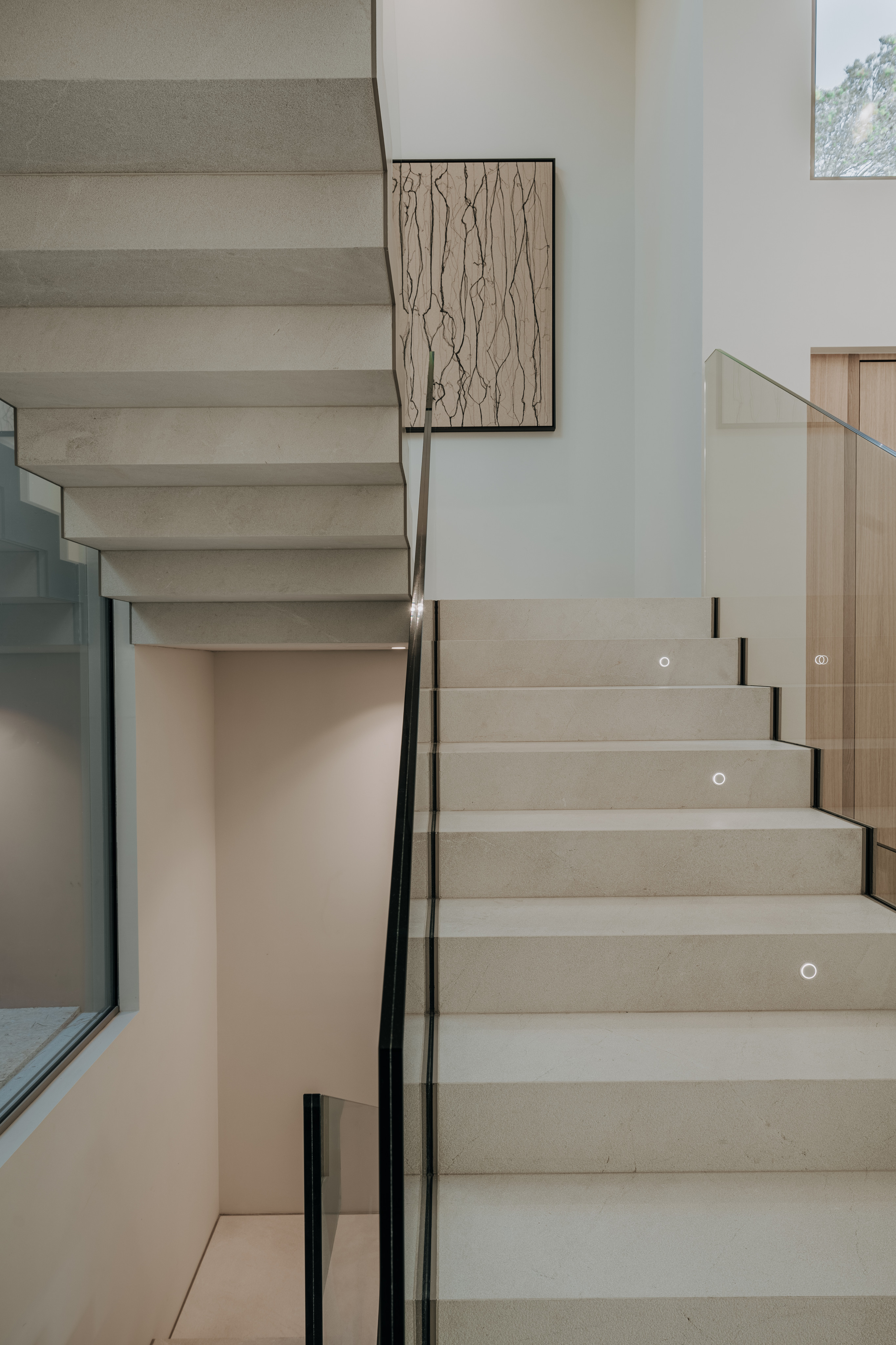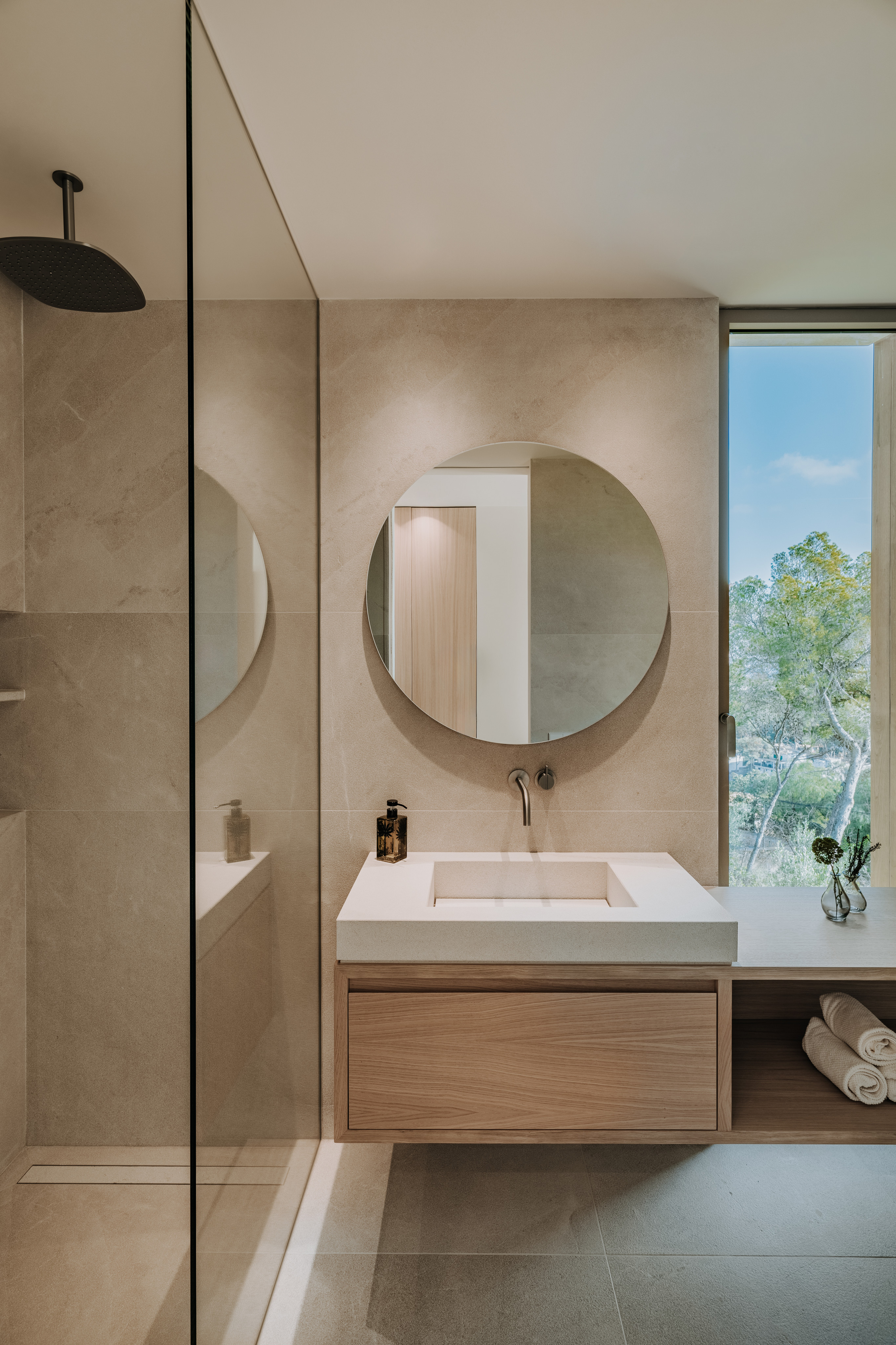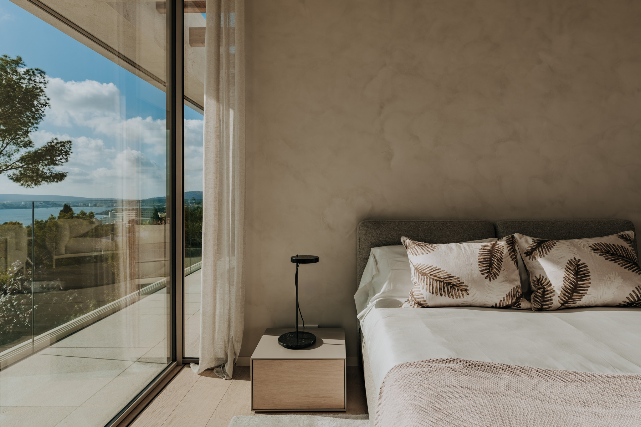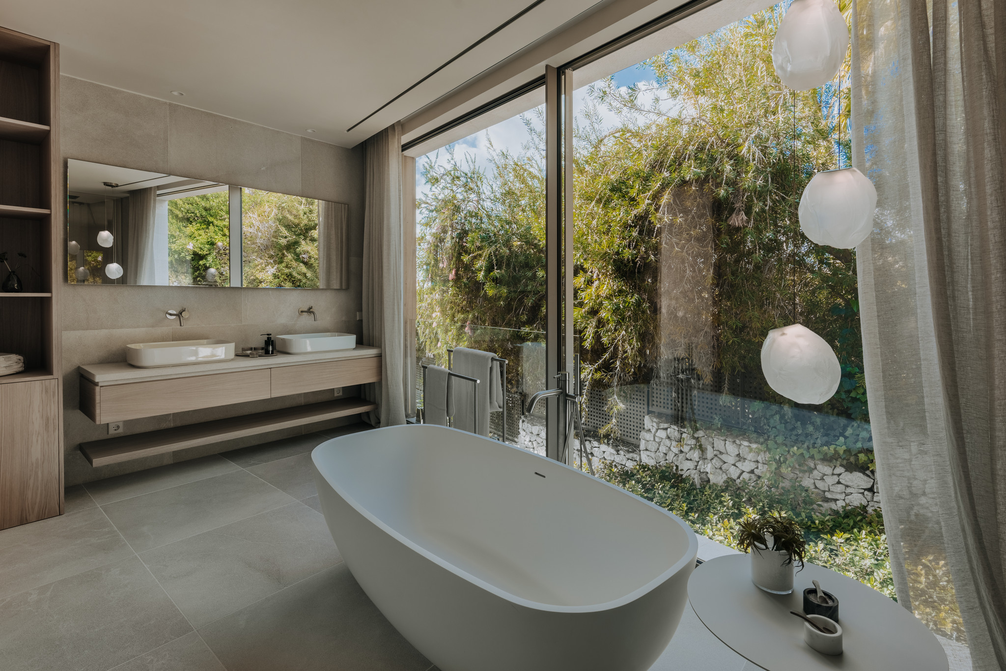 Zeitlose Ästhetik und authentische Natürlichkeit kennzeichnen auch den Materialmix der Villa. Ob handwerklich bearbeiteter Naturstein für die Böden und Wände, hochwertige spanische Eiche für Verkleidungen, Elemente aus Leinen oder Geländer aus Glas, die das offene Raumgefühl unterstreichen – jedes Material trägt auf seine Weise zu einem exklusiven Raumgefühl bei. Dabei wird leidenschaftlich Wert auf kleinste Details gelegt. So werden Wandsteine beispielsweise anhand ihrer Aderung ausgewählt und entsprechend angeordnet. Die anspruchsvollen Möbel werden ausschließlich von ausgewählten Qualitätstischlern gefertigt. Und auch Armaturen sowie Küchentechnik kommen ausnahmslos von renommierten Herstellern. Für ein luxuriöses Gesamtkunstwerk, das bis ins letzte Detail höchsten Ansprüchen gerecht wird.