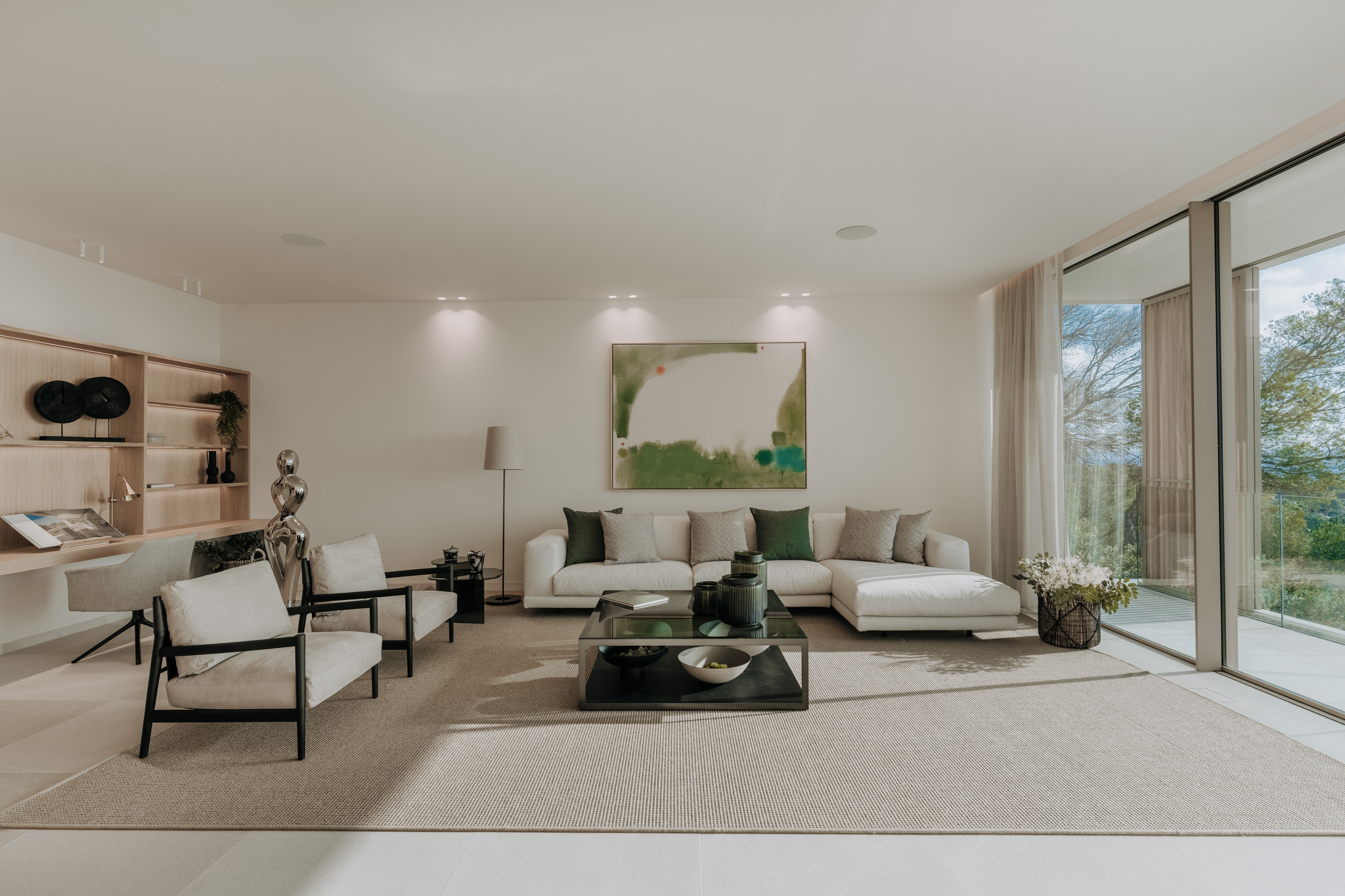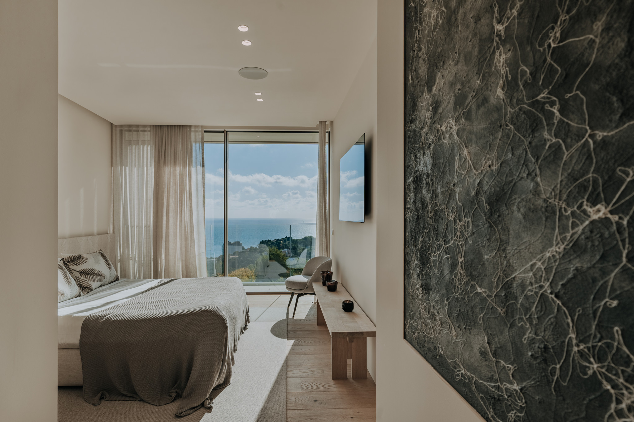 Inspiriert von dem atemberaubenden Meerblick ist auch das Innere der Villa offen und anziehend gestaltet. Offen schweift der Blick durch raumhohe Panoramafenster auf das weite Meer. Klare Linien werden durch natürliche Elemente aus edlem Holz und Naturstein aufgelockert. Helle mediterrane Farben wechseln sich mit Erdtönen ab und werden durch leichte Farbakzente ergänzt. Ein besonderer Reiz liegt im gelungenen Mix aus modernen und traditionellen mallorquinischen Elementen. Zum Ausdruck kommen diese Elemente nicht zuletzt durch ein ausgefeiltes Lichtkonzept mit indirekter Beleuchtung, das stets für angenehme Atmosphäre sorgt. Und auch der mediterran gestaltete Außenbereich überzeugt mit einer Mischung aus klarer Gestaltung und liebevoll ausgewählten Pflanzen, die das einzigartige Lebensgefühl unterstreichen.